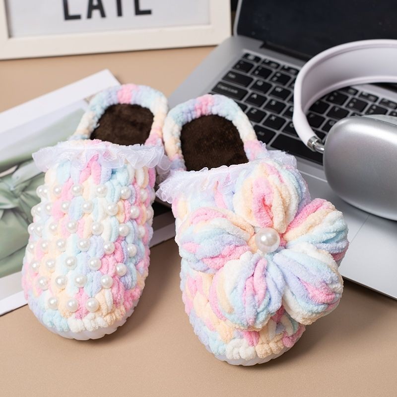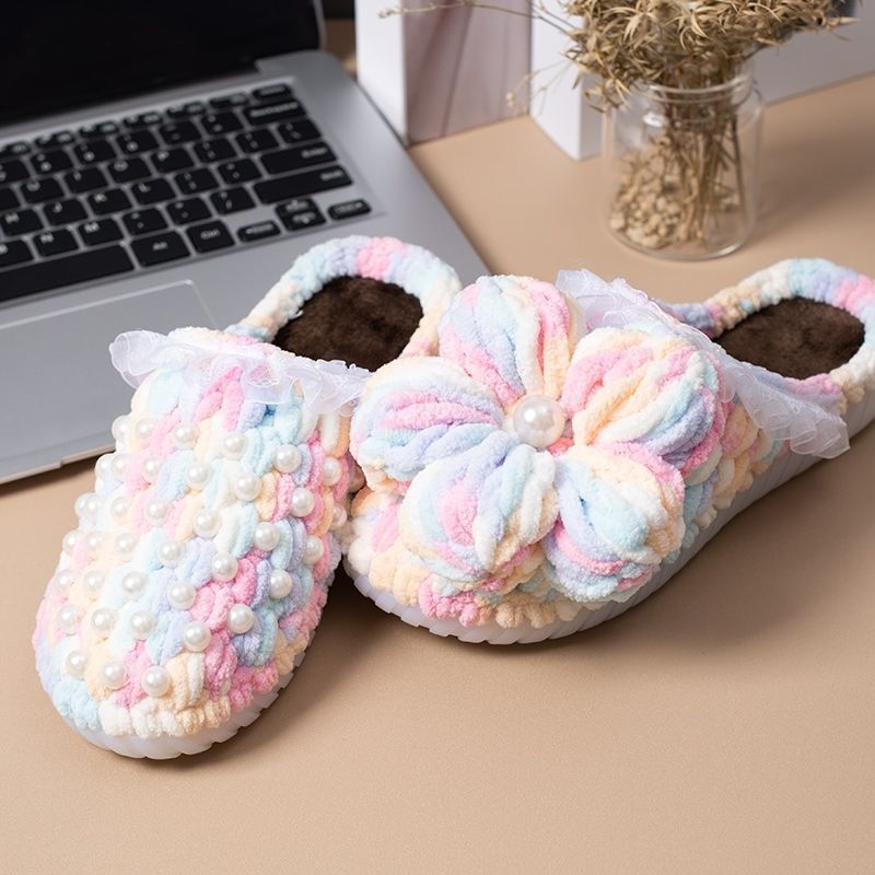 Hand-crocheted puff flower slippers crystal sole slippers anti-slip ice strip wool pearl crystal sole material bag
