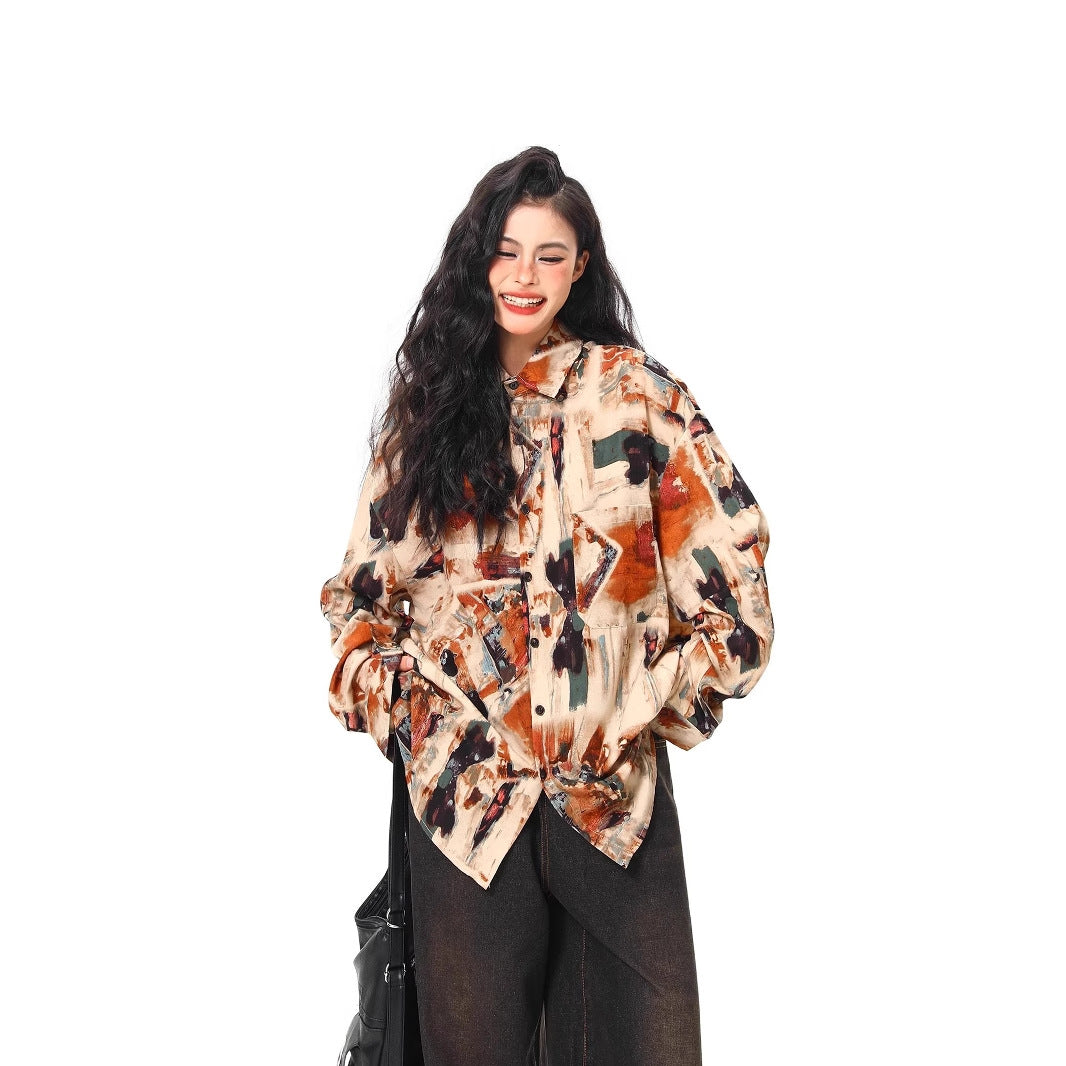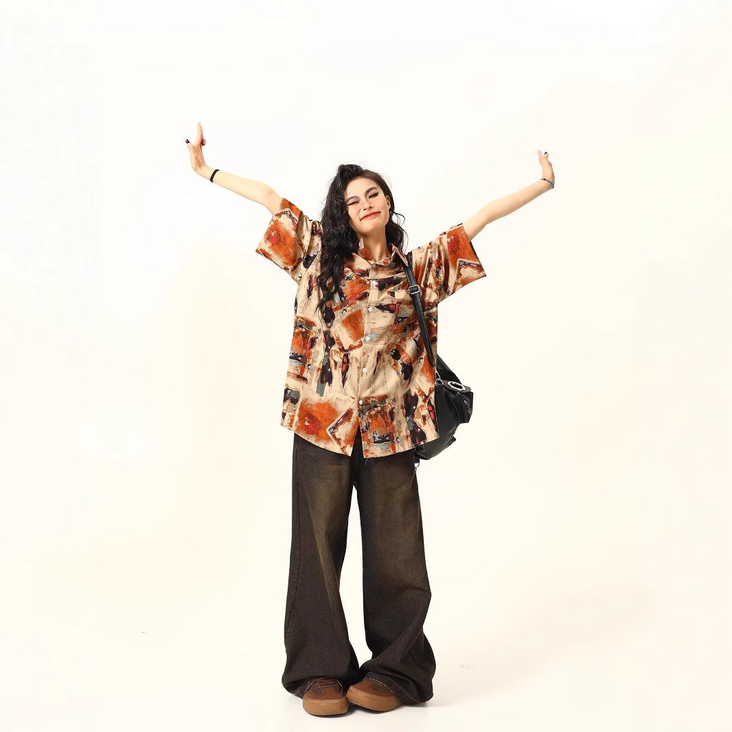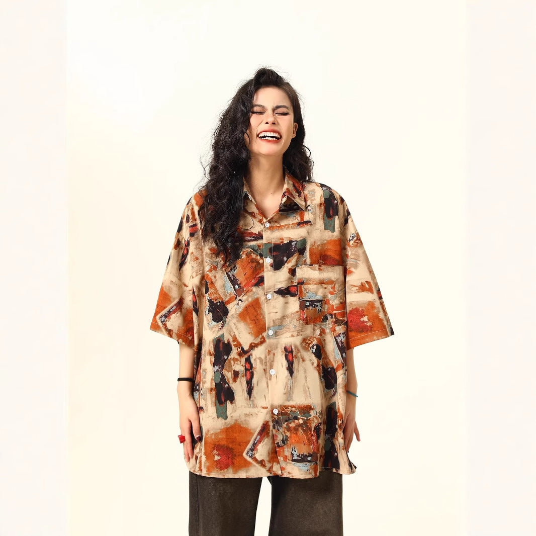 Hong Kong style retro baroque short-sleeved floral shirt summer American style unique oil painting style loose Cuban collar shirt hip girl